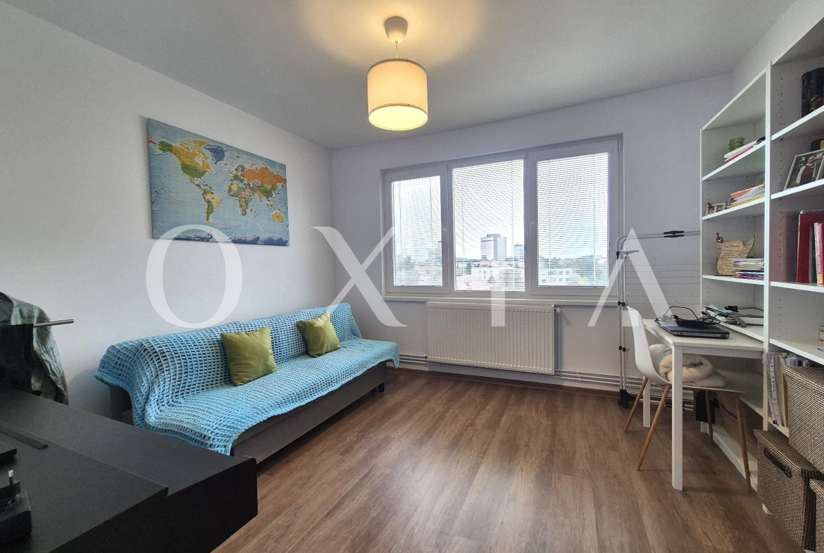 0XIA prezinta spre vanzare apartament cu 3 camere, situat in Timisoara, Zona Take Ionescu aproape de Punctele Cardinale, la etajul 6/10, imobil cu ascensor, semidecomandat, cu suprafata de 69 MP utili + balcon inchis de 8.5 MP + boxa inalta pentru depozitare, compartimentat astfel: