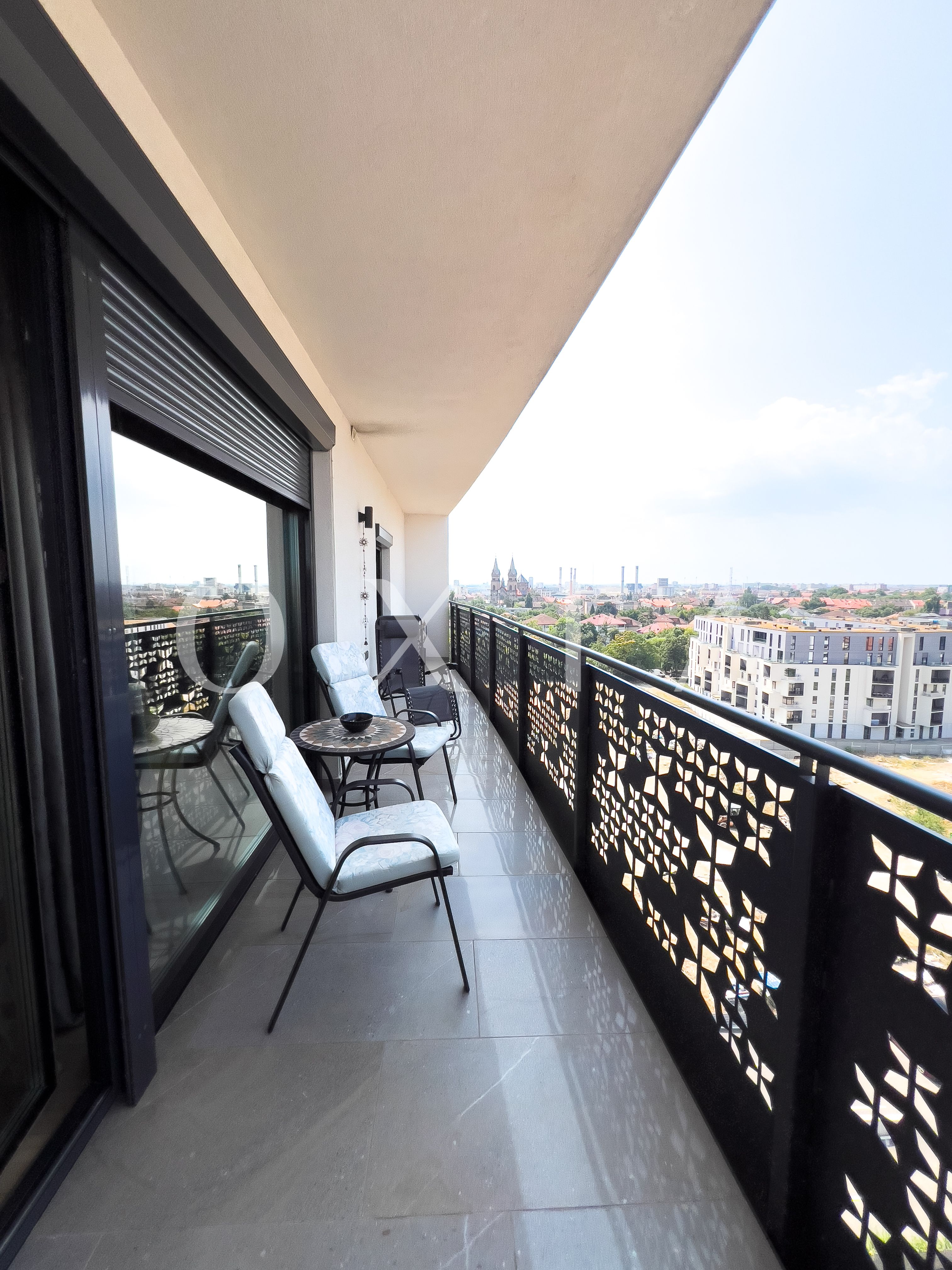 Apartamentul dispune de o vedere panoramica spectaculoasa asupra orasului, oferind un peisaj deosebit si un sentiment de spatiu deschis.