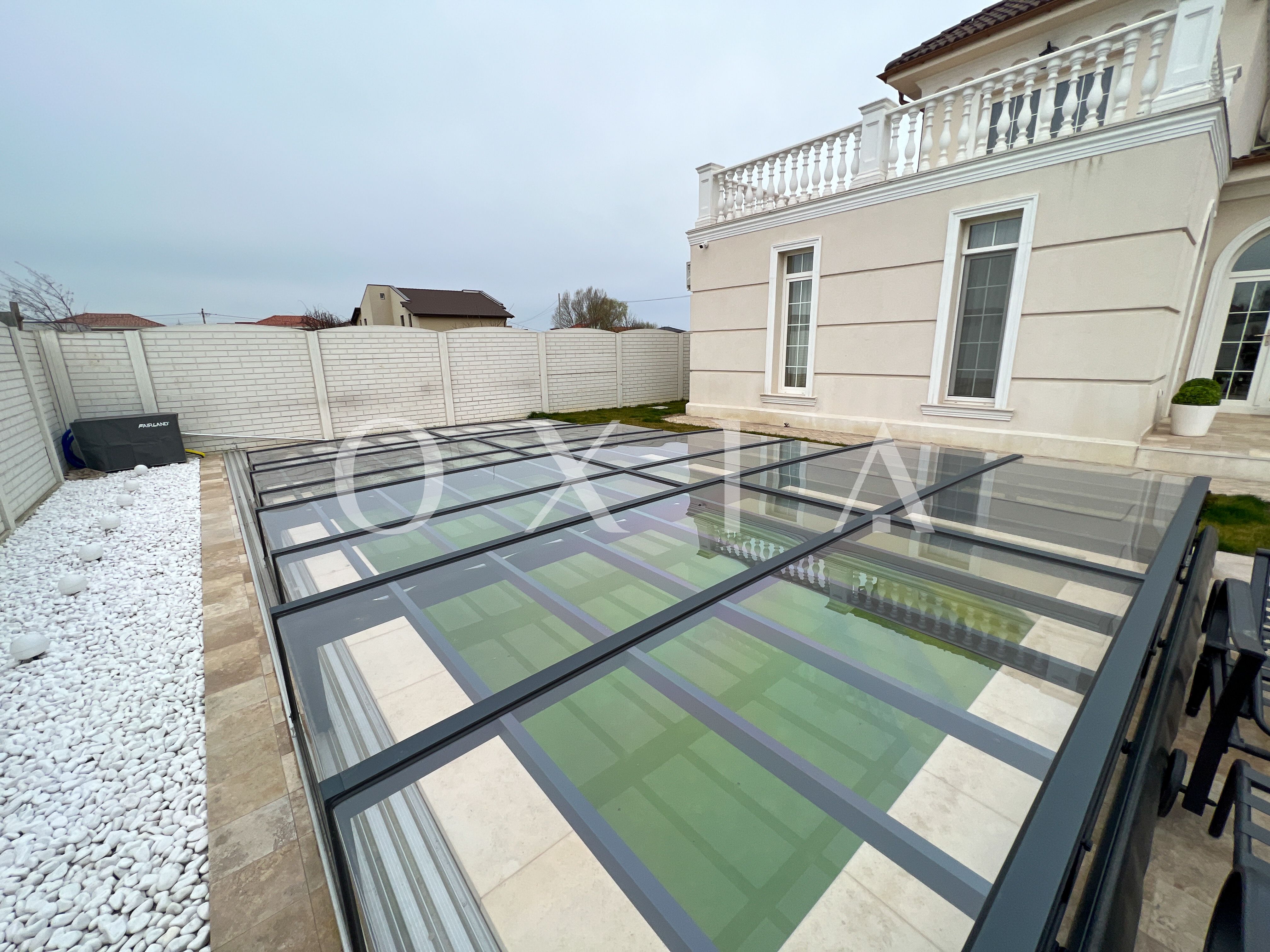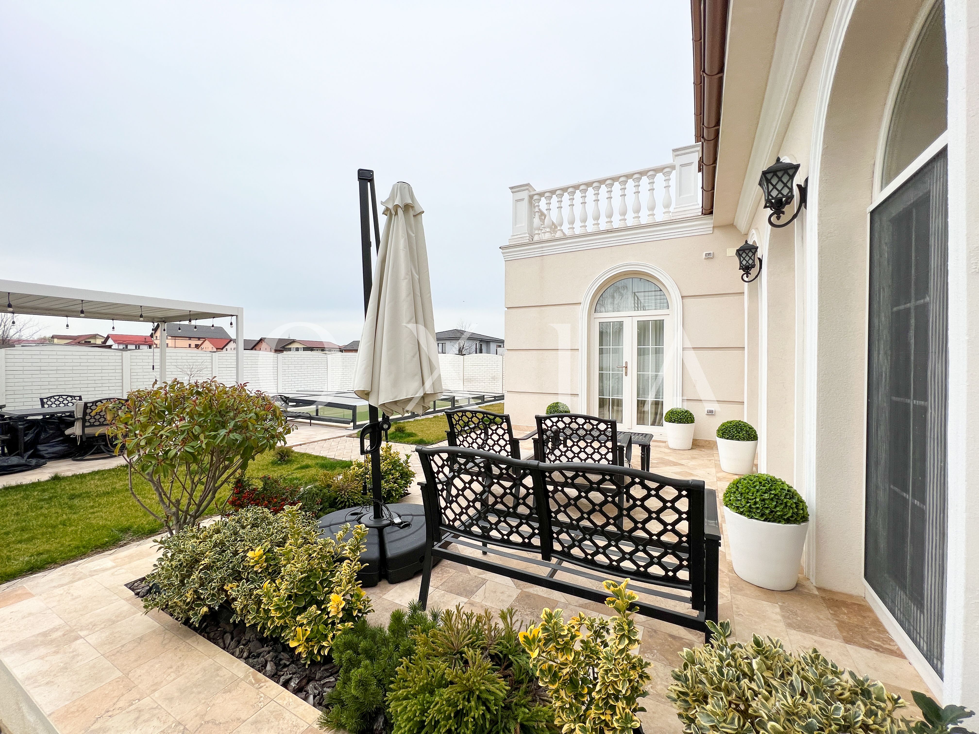 Curtea este la fel de impresionanta, cu o terasa mare de 20 MP, foisor, zona pentru gratar si o piscina incalzita si acoperita.