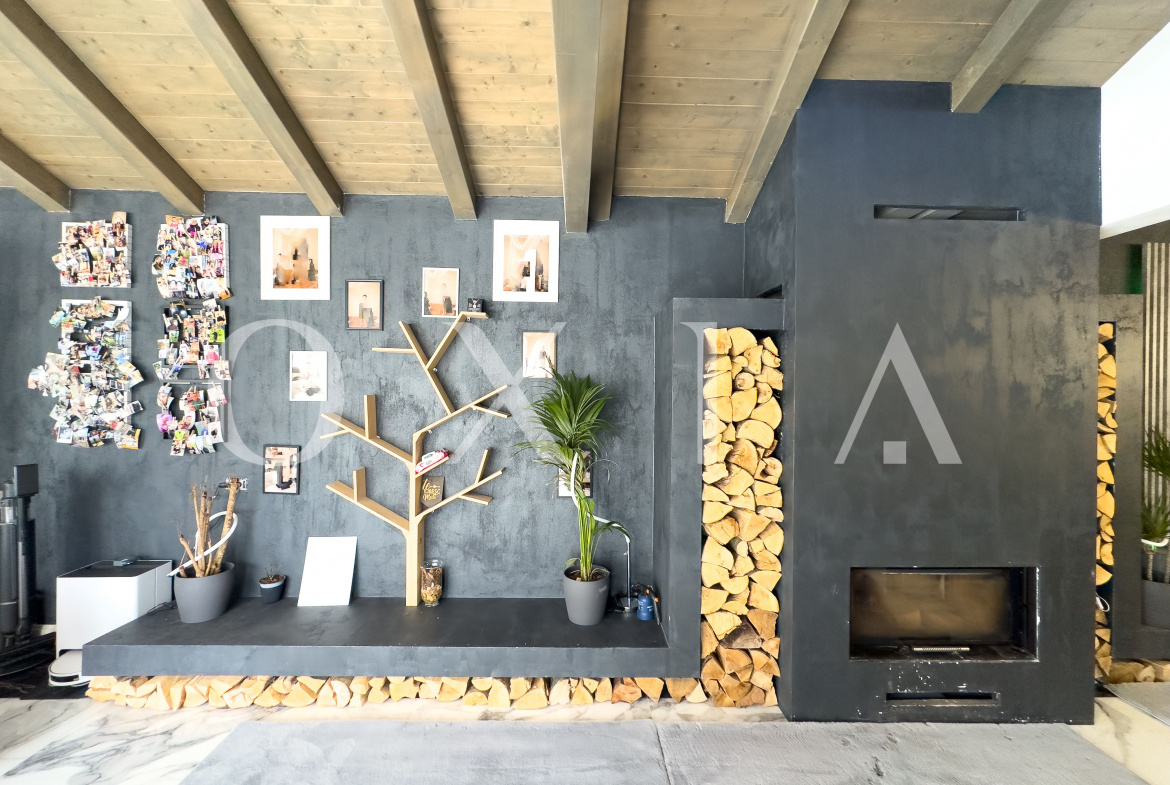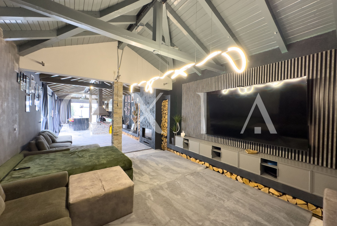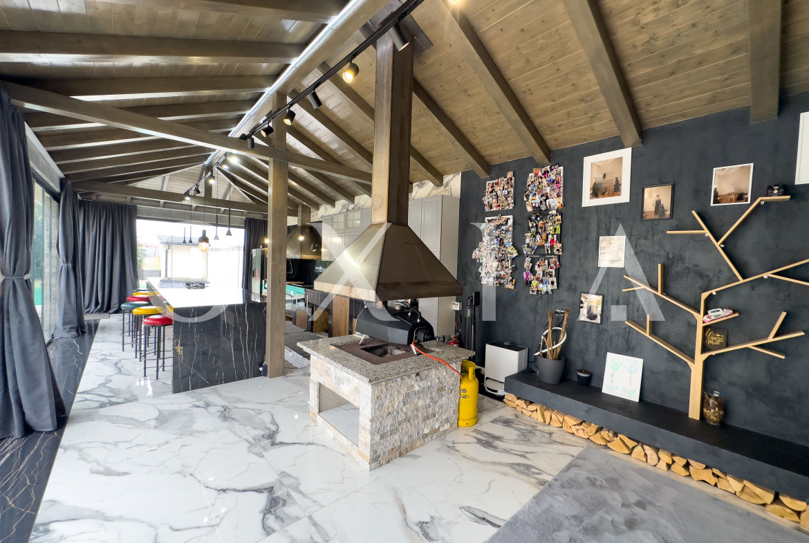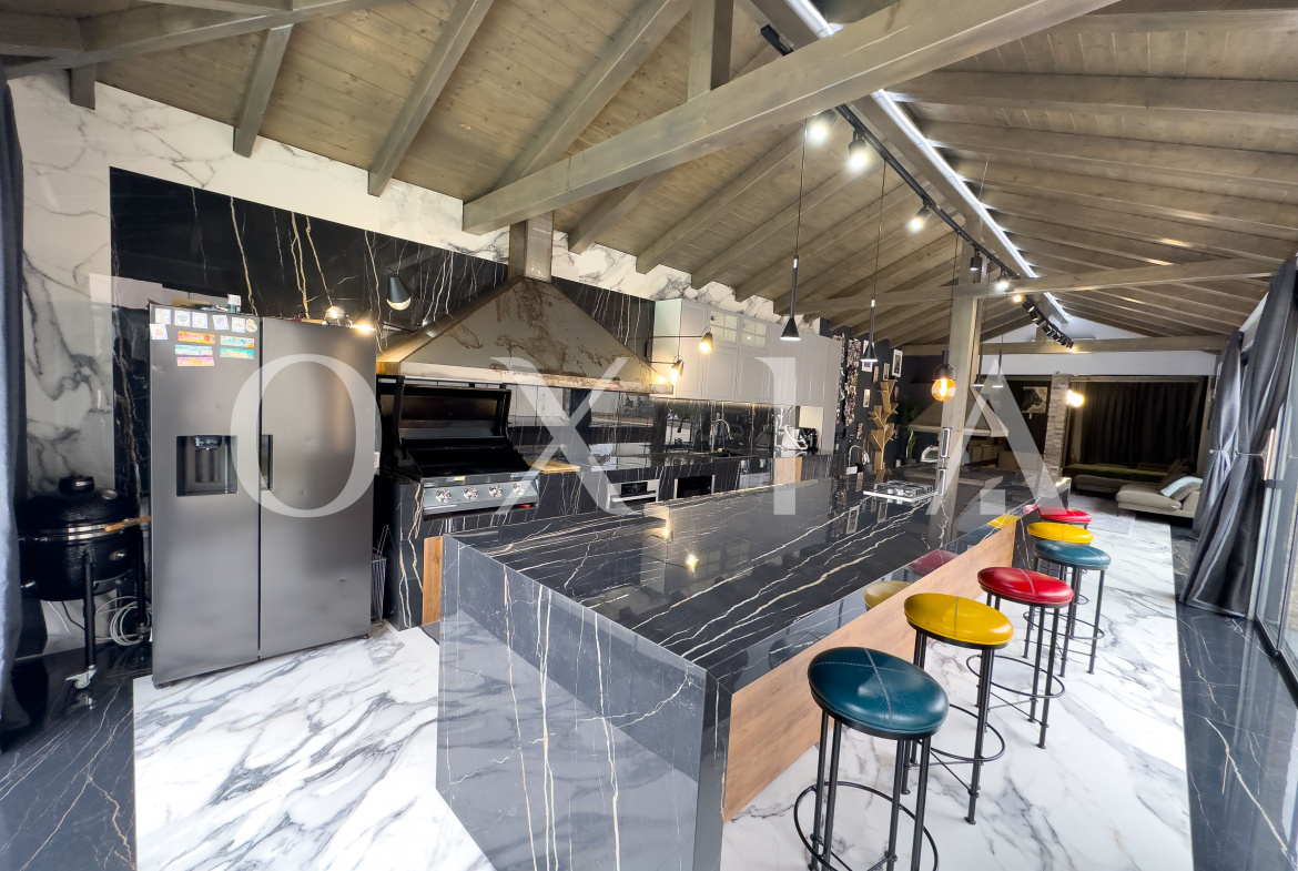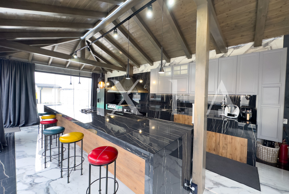 Aceasta dispune de o insula multifunctionala, semineu profesional pe lemne, gratar pe gaz Beef Eater, plita cu inductie, gratar pe lemne, cuptor de pizza, doua hote profesionale cu motoare Gemi si ferestre culisante pentru utilizare pe timp de vara.