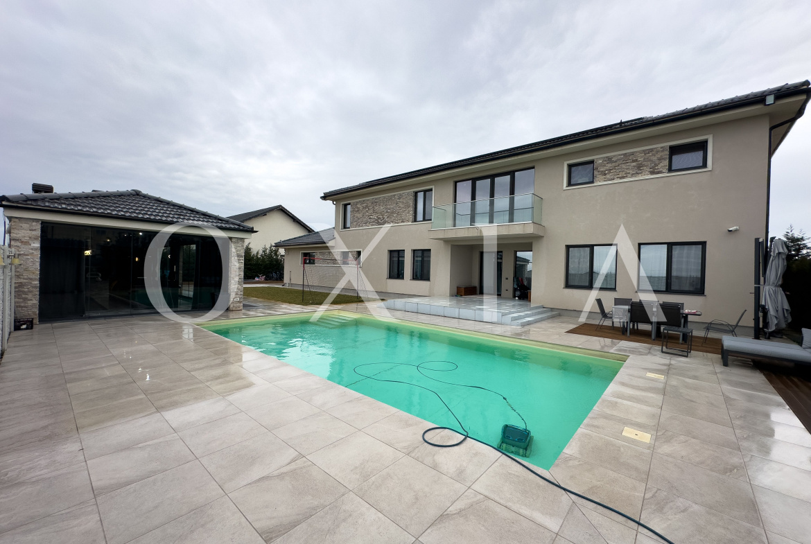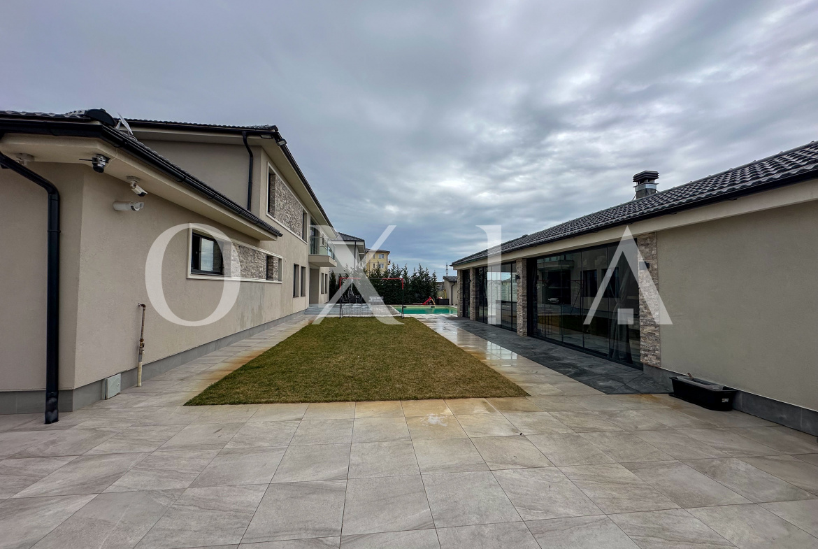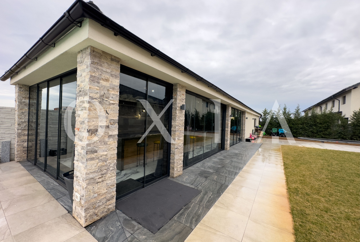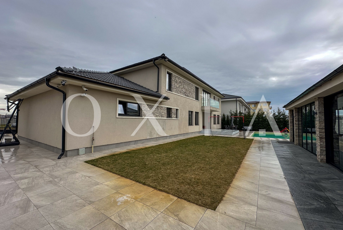 Spatiul exterior este amenajat la cele mai inalte standarde, incluzand piscina incalzita cu pompa de caldura de 25 kW, suprafete pavate cu travertin pentru trafic intens, garaj pentru doua masini, gazon si arbori ornamentali, casuta pentru depozitare, sistem automat de irigare, foraj de apa, piatra ornamentala Thassos, porti si panouri de gard executate la comanda.