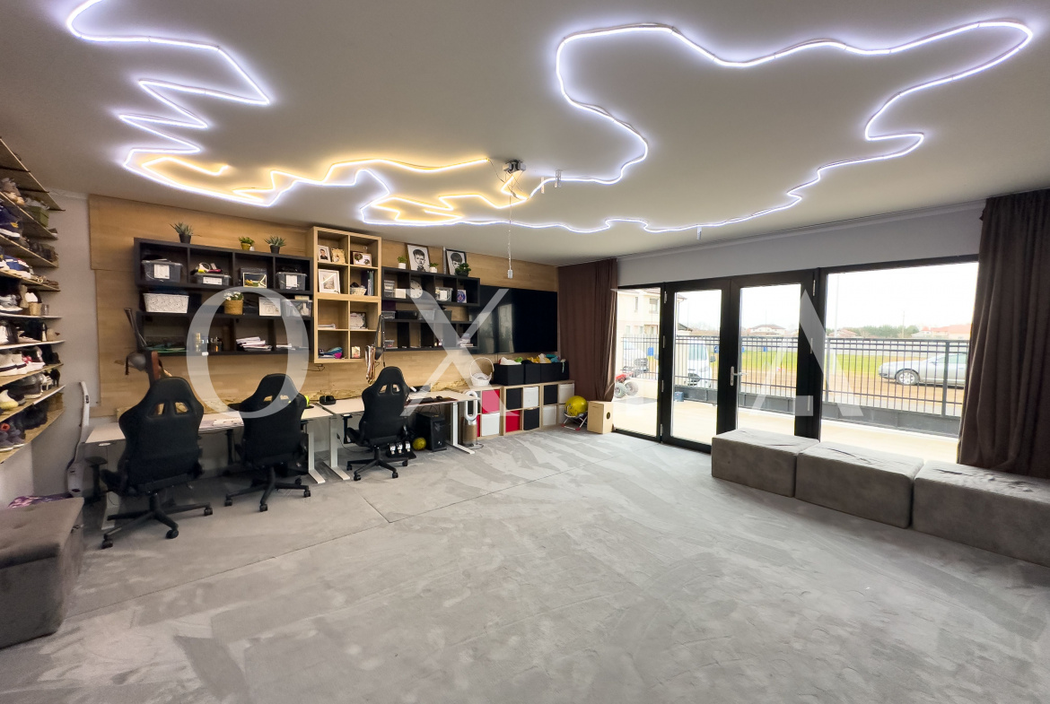 PARTER: hol de acces spatios, living generos cu bucatarie open space, zona de dining, birou, baie, camera de joaca pentru copii, debara, camera tehnica si terasa acoperita.