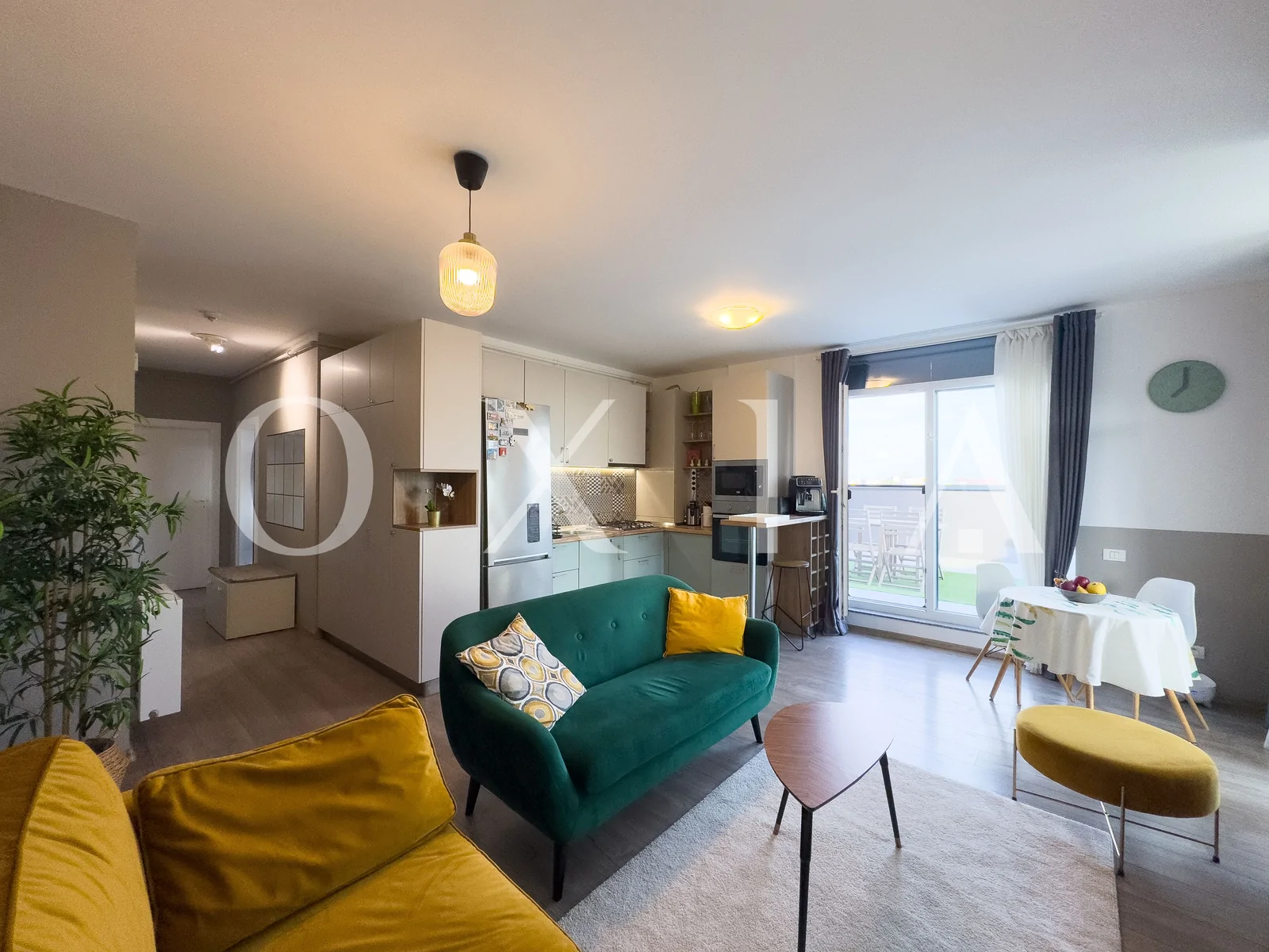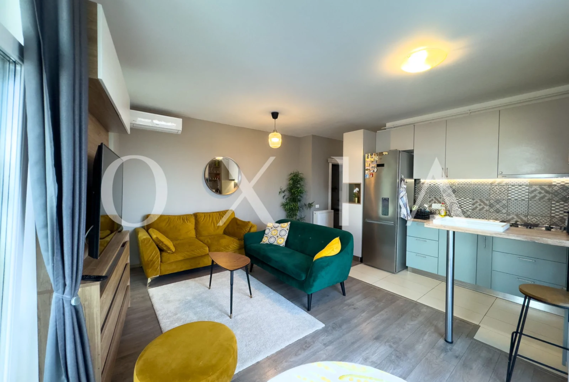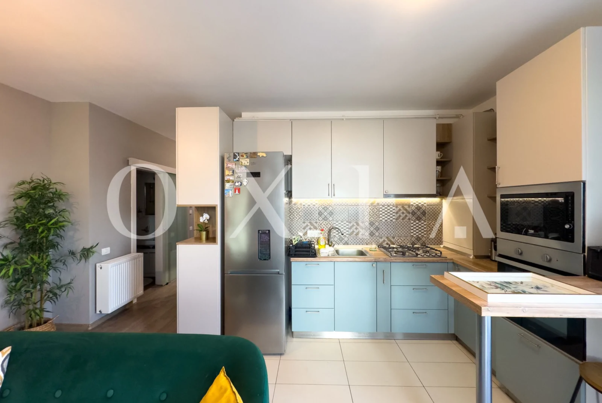 Living luminos cu bucatarie open-space, complet mobilata si utilata