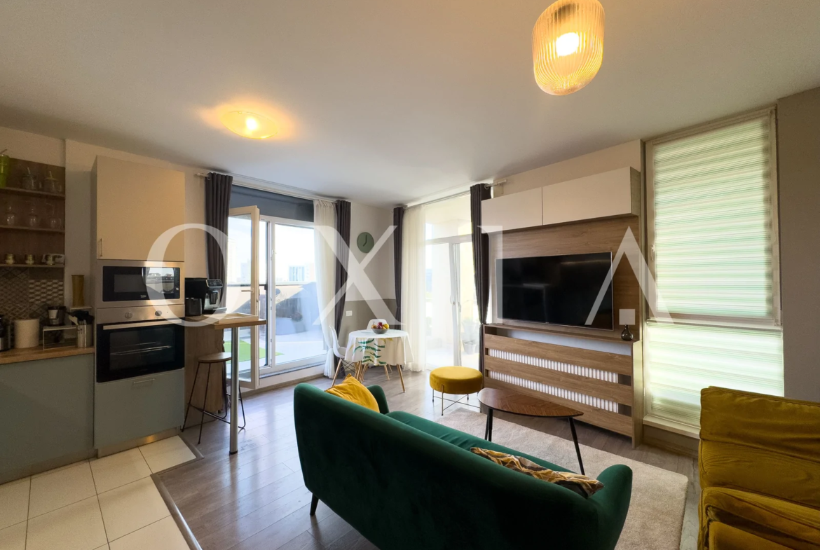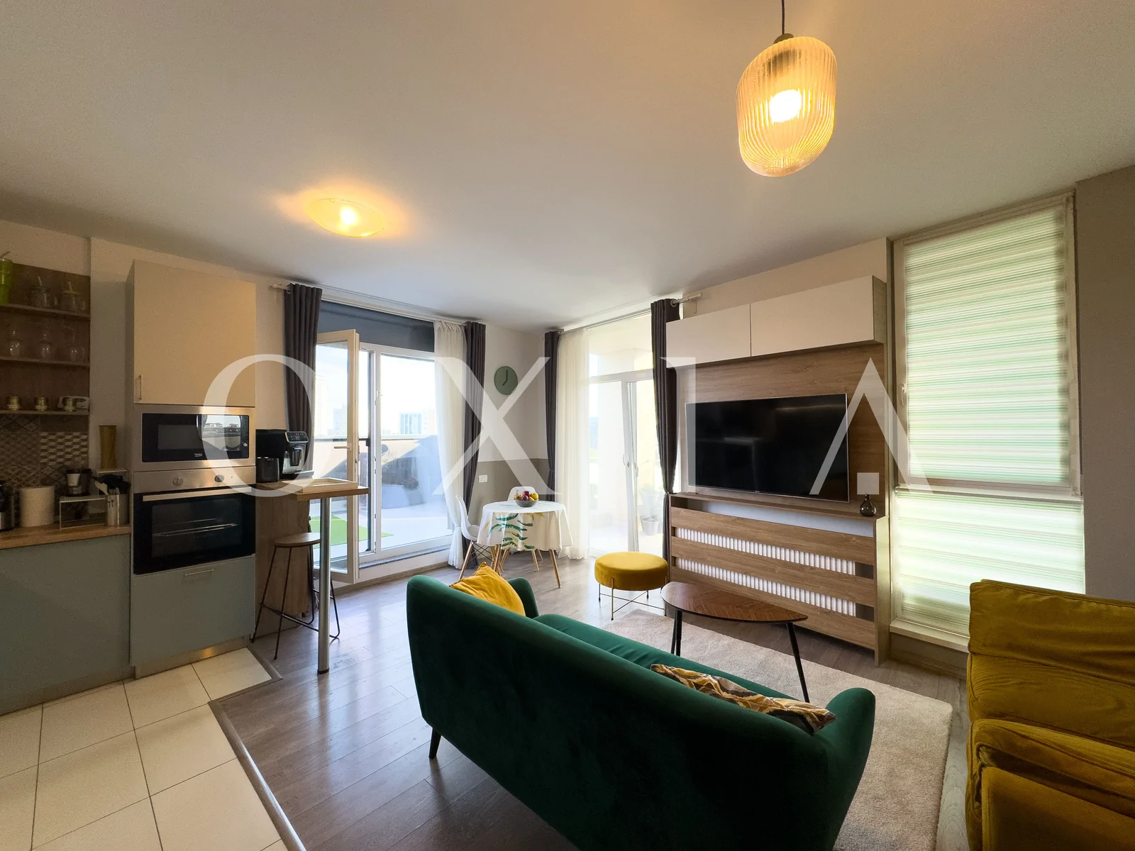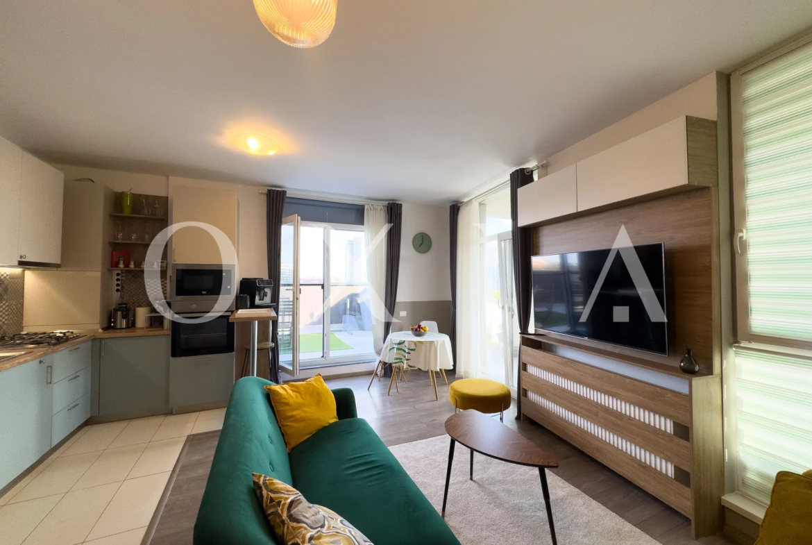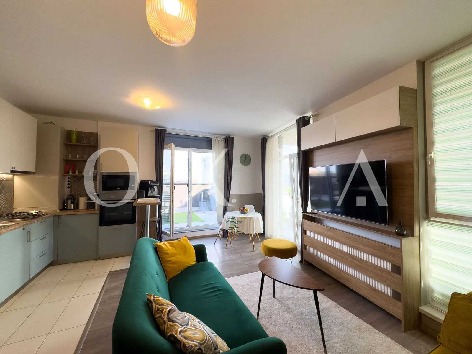 Living luminos cu bucatarie open-space, complet mobilata si utilata