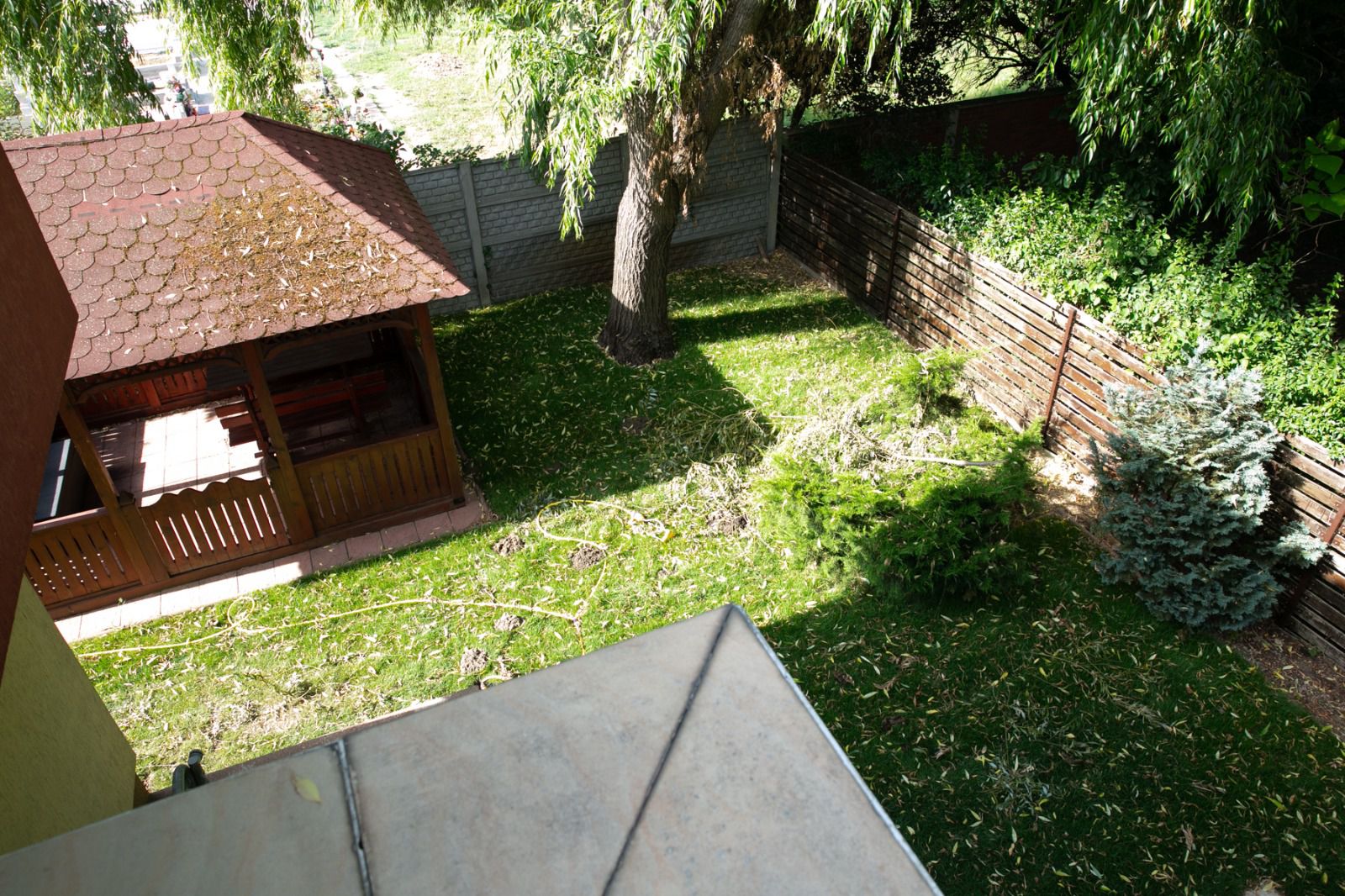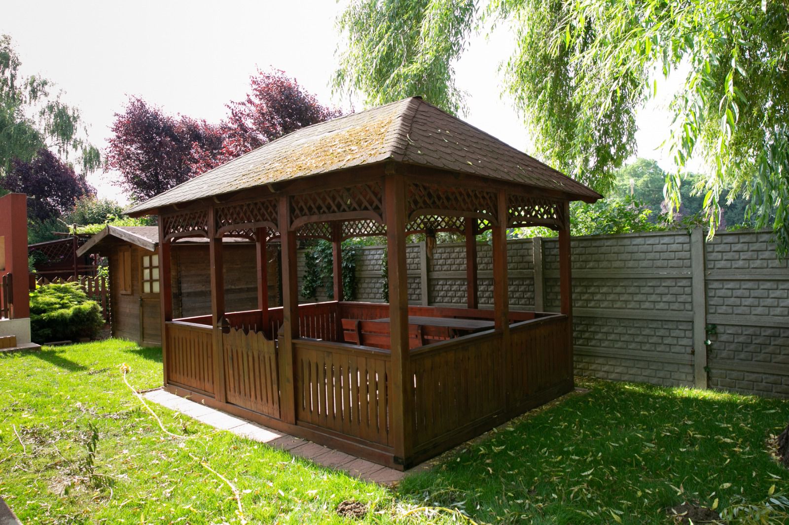 Curtea este amenajata cu gazon, un foisor si pomi fructiferi.