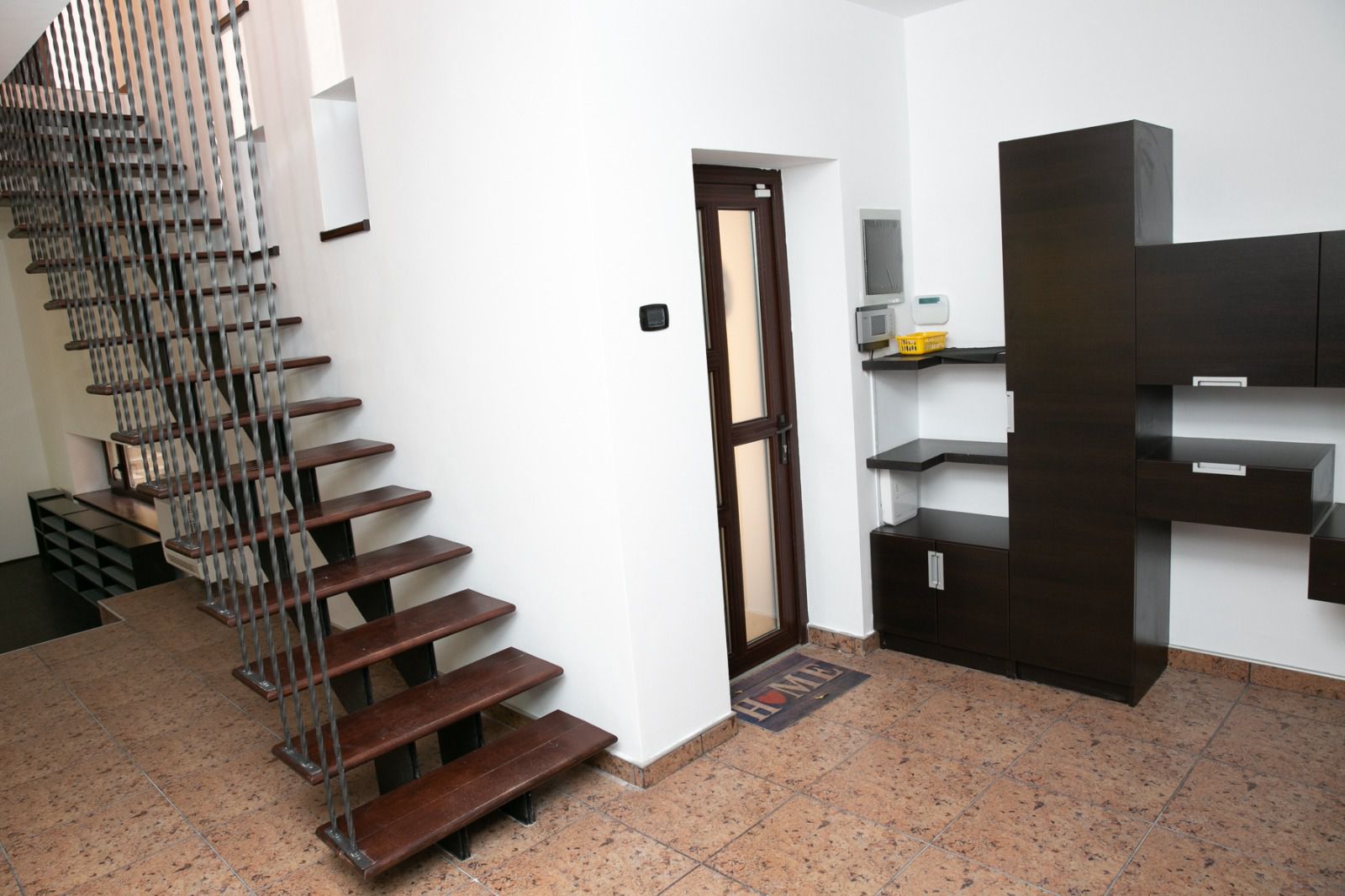 Parter: hol acces, dormitor de oaspeti/birou, bucatarie cu iesire pe terasa exterioara, camera tehnica/debara,dinning, living, baie
