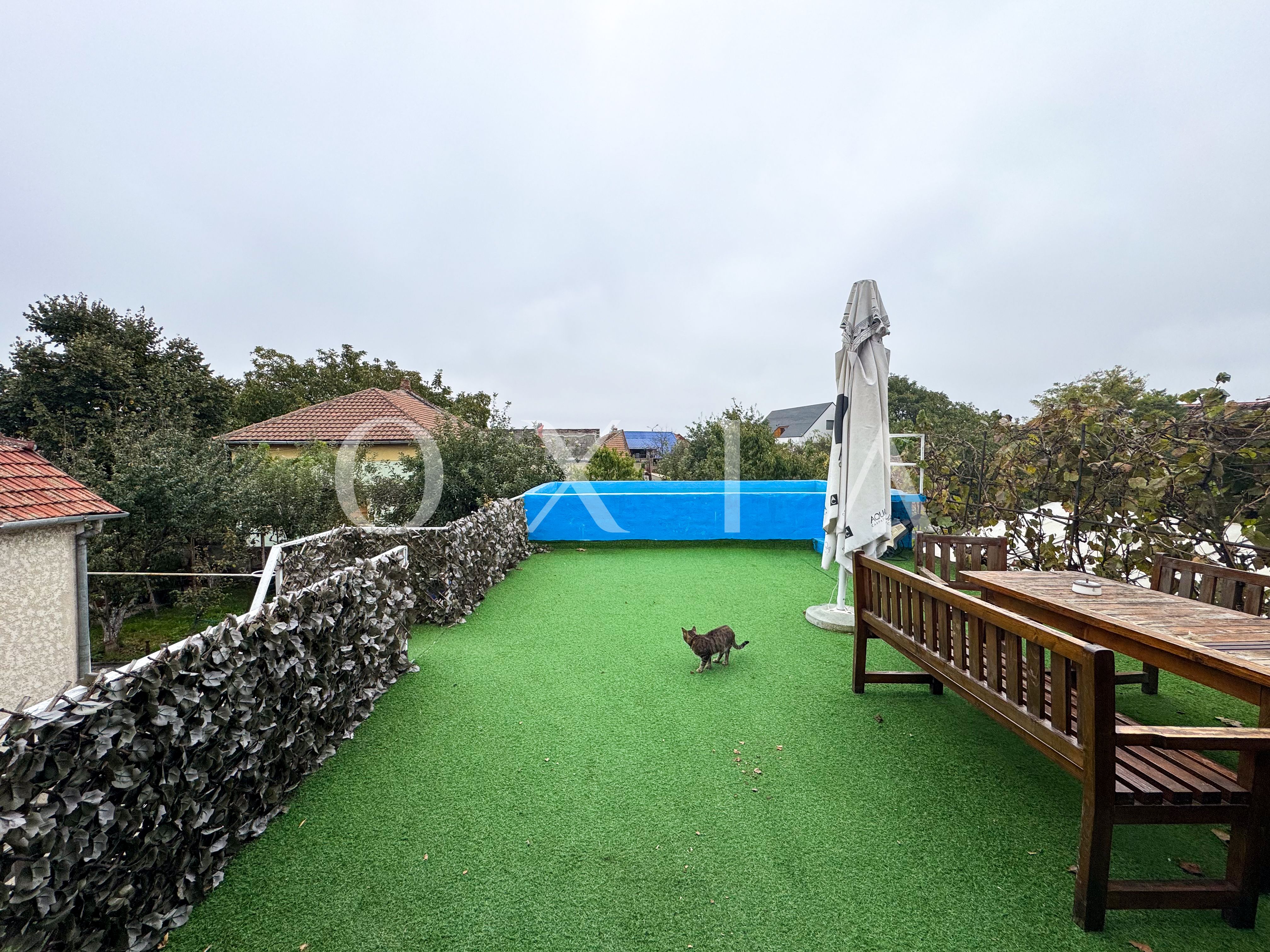 Exteriorul proprietatii este amenajat cu alei betonate, gazon si plante ornamentale, creand un spatiu verde placut si functional.